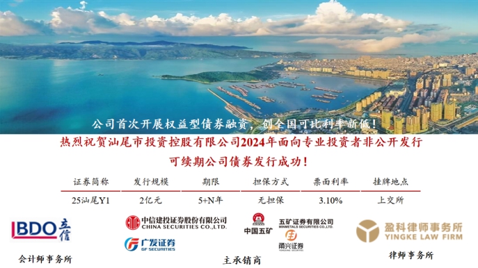 2025年2月19日,汕尾市投資控股有限公司(以下簡(jiǎn)稱“投控公司”)在上海證券交易所成功發(fā)行2億元無(wú)擔(dān)保可續(xù)期公司債券,發(fā)行期限5+N年期,票面利率3.10%,本次為公司首次發(fā)行權(quán)益類產(chǎn)品,發(fā)行利率創(chuàng)公司歷年發(fā)行公司債券利率新低。 本次成功發(fā)行可續(xù)期公司債券,是公司對(duì)權(quán)益型債券產(chǎn)品融資的一次全新探索,也是融資模式的進(jìn)一步創(chuàng)新突破,有效降低公司資產(chǎn)負(fù)債水平和融資成本,提升公司剛性債務(wù)保障能力,為公司后續(xù)承接重大項(xiàng)目打下了堅(jiān)實(shí)基礎(chǔ)。下來(lái),市投控公司將緊緊圍繞省委“1310”具體部署和市委“1+2+9”工作安排,進(jìn)一步提升資產(chǎn)規(guī)模、拓寬融資渠道、創(chuàng)新融資模式,奮力提升國(guó)企戰(zhàn)略支撐能力,引導(dǎo)推動(dòng)優(yōu)質(zhì)金融資源聚焦重點(diǎn)產(chǎn)業(yè),為汕尾經(jīng)濟(jì)社會(huì)高質(zhì)量發(fā)展貢獻(xiàn)更多投控力量。